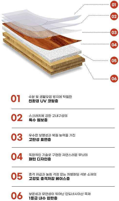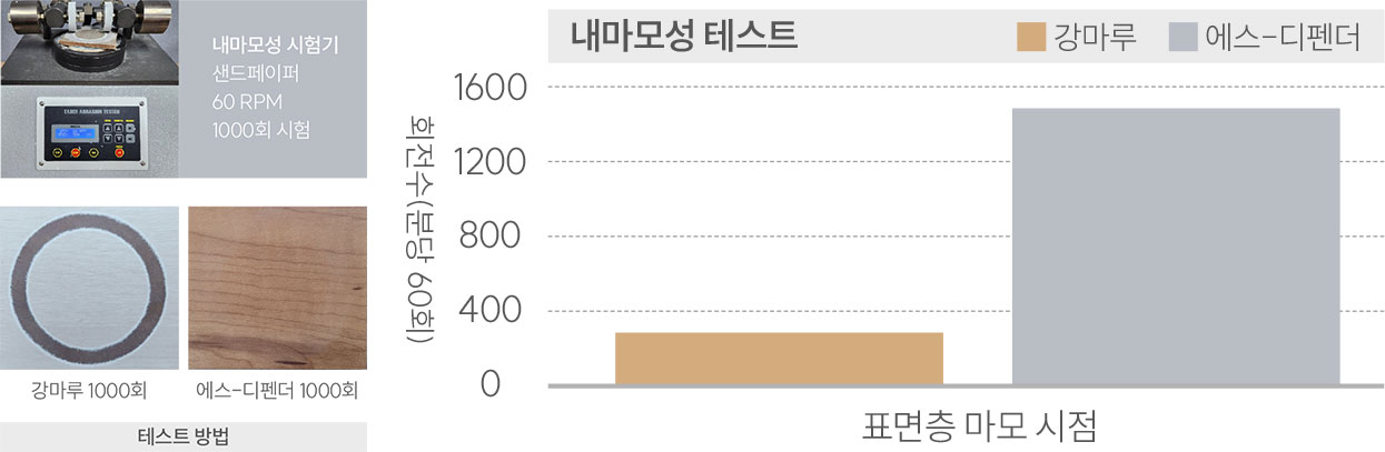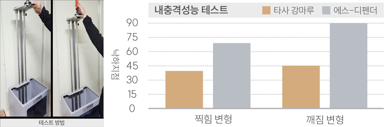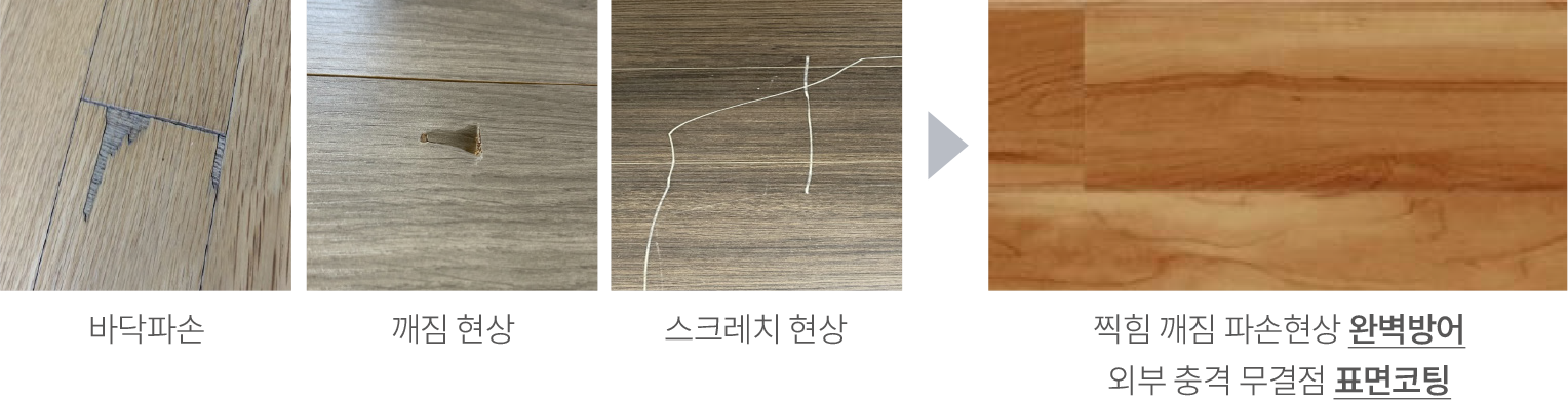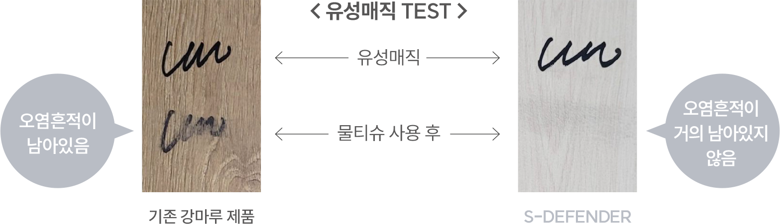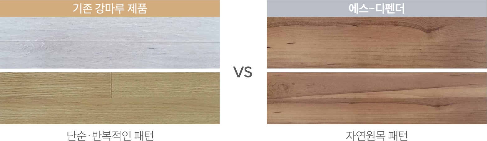 에스 디펜더는 표면층에 고강도 소재를 적용하여 한층 강화된 바닥 표면층으로