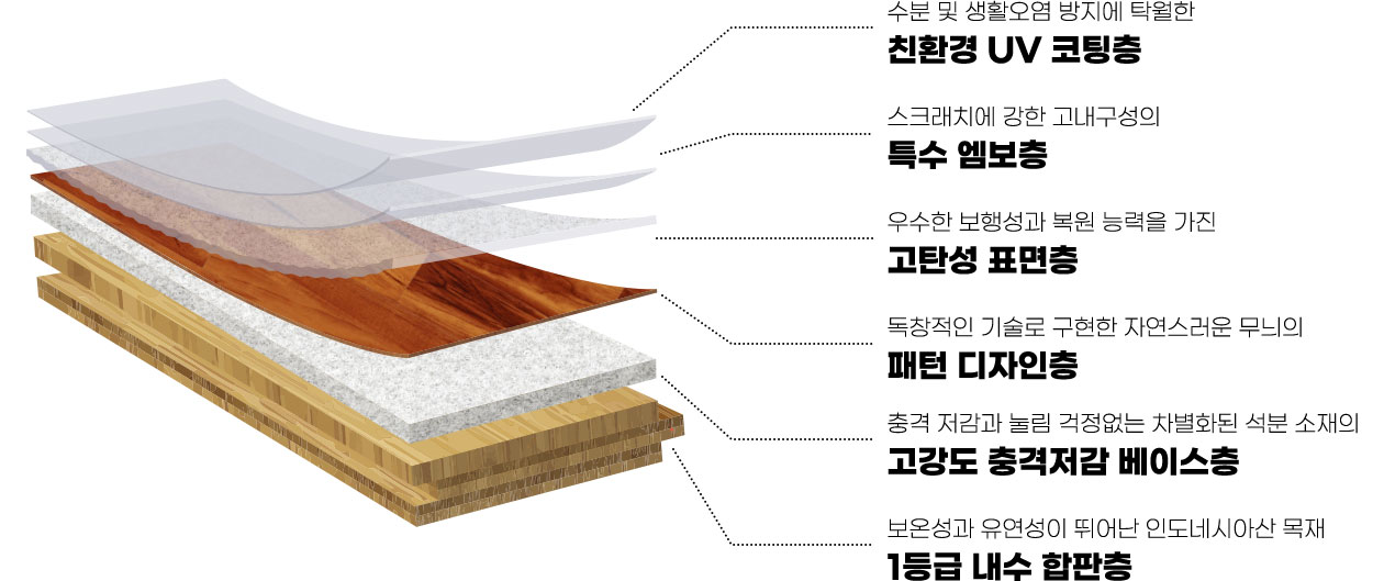 에스 디펜더는 표면층에 고강도 소재를 적용하여 한층 강화된 바닥 표면층으로